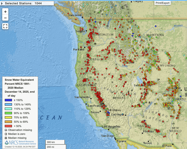 Unfortunately, it will be a pretty warm event with snow levels quite high. The snowpack in the West is already running well below where it should be this time of year. Most stations have less than 50% of what their normal snow water equivalent is: