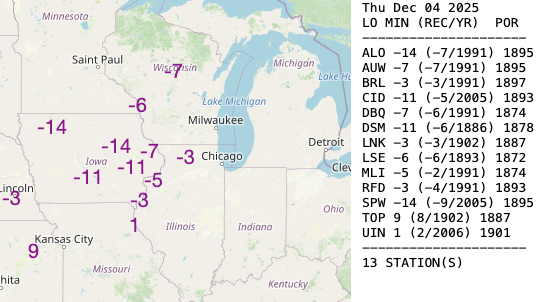 Cold records are still likely Thursday AM across the Midwest. Waterloo, IA (ALO) looks to break its previous record for Dec 4th by 7°! Cedar Rapids (CID) and DSM (DSM) could break theirs by 5 or 6°, impressive cold for this early in the season: