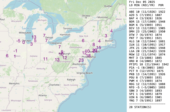 By Fri AM, the record low potential stretches into the Northeast where a place like Bridgeport, CT (BDR) could break their record by 2°: