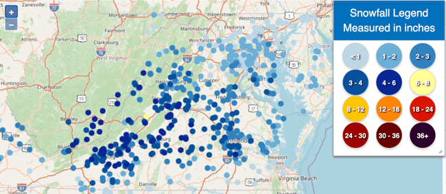 Further north, parts of the Mid Atlantic saw their first measurable snowfall of the season! The I-81 corridor up into the Washington, DC area all received snow, with totals 2-4" range with a few locally higher amounts: