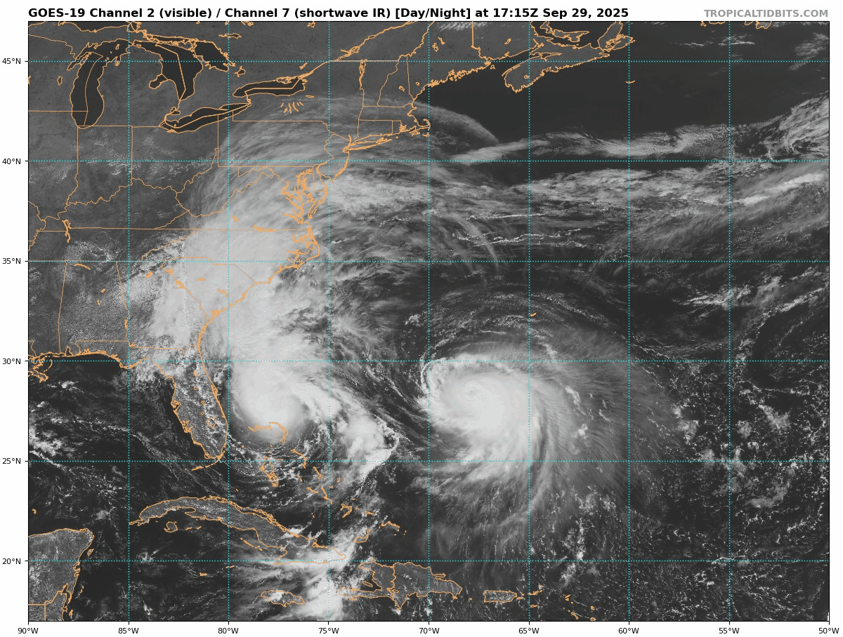 It isn't that often that you see two storms spinning so close off of the Southeast coast of the US but Imelda and Humberto are putting on quite the satellite show today: