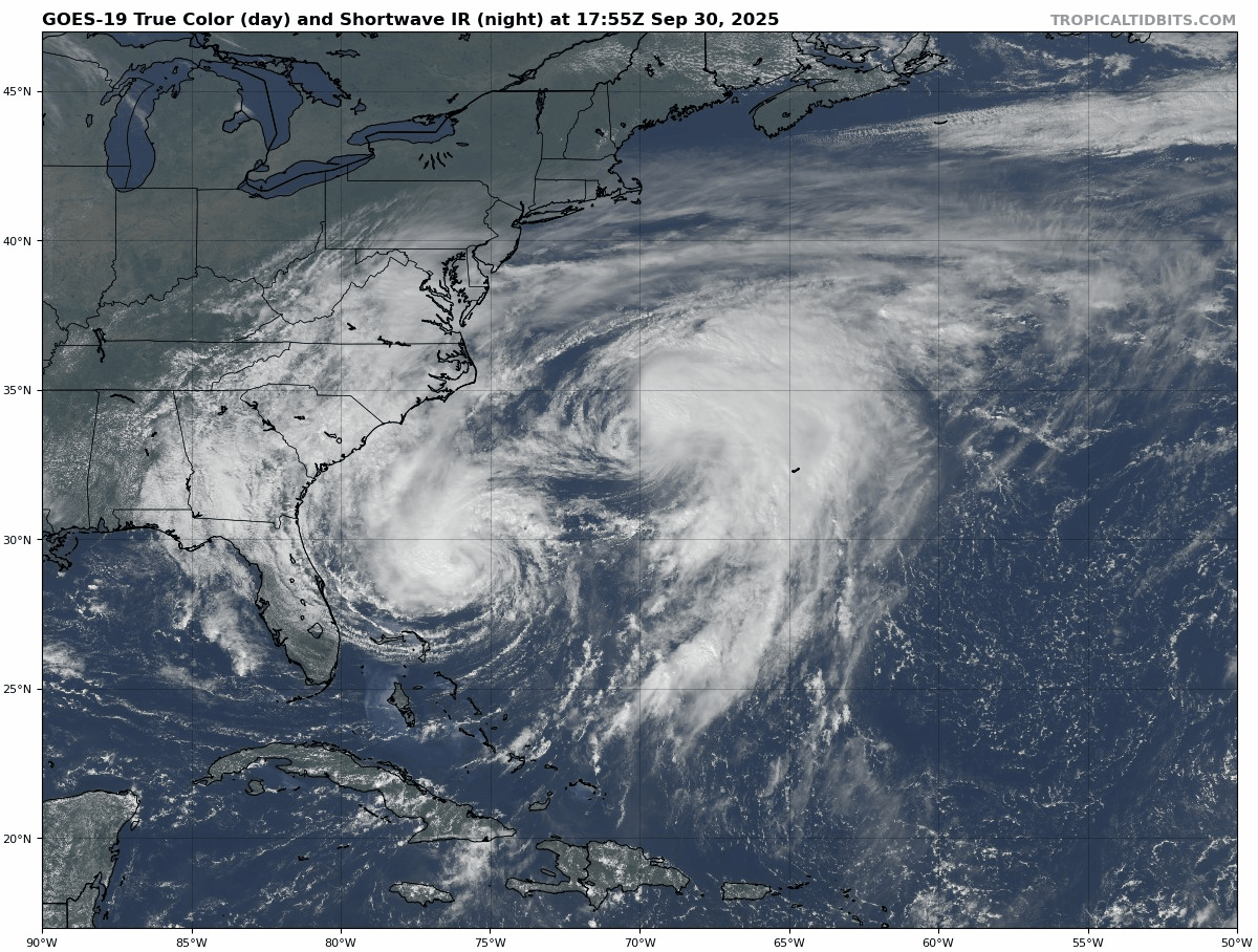 Imelda strengthened to the fourth hurricane of the 2025 season earlier in the day on Tuesday. The satellite image of it and Humberto off the southeast coast is one of the more impressive things you'll see. In fact, according to Michael Lowry, the two hurricanes were less than 500 miles apart at 8 am Tuesday morning, the closest on record in the satellite era: