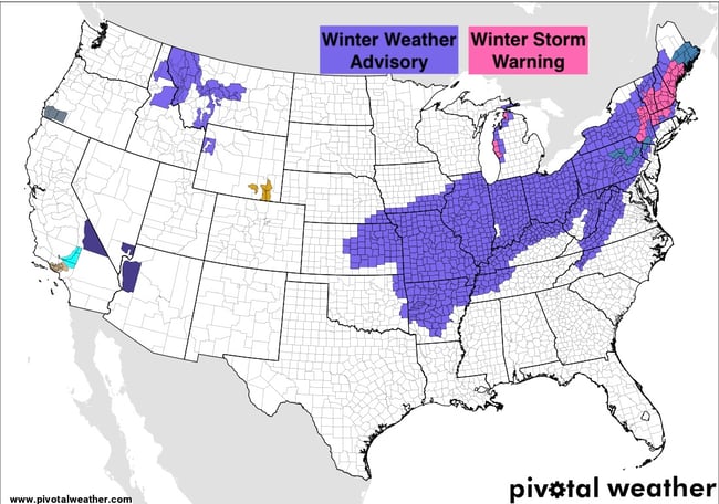 Winter Weather Advisories stretch from the Southern Plains to the Northeast and New England with a Winter Storm Warning up for parts of southern New England: